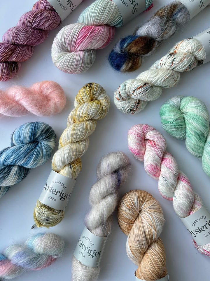 Vi farver garn med stor passion, både med tanke på farveleg, men også med det færdige strik in mente. Vi håndfarver på forskellige kvaliteter og elsker at se, hvordan farvespillet kan forandre sig fra kvalitet til kvalitet. Det håndfarvede garn og tilbehør til strik finder du her på webshoppen og i butikken. Vi håndfarver alt vores garn i Aarhus, og sender til hele verden.